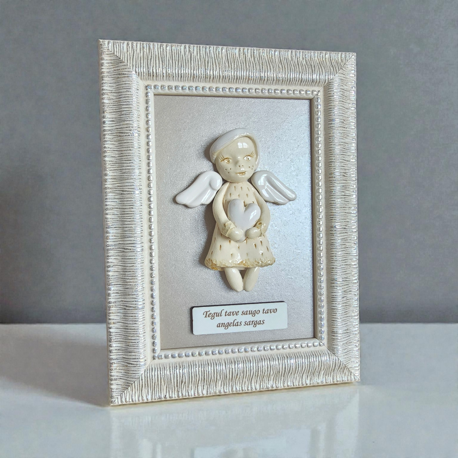 Šis  keramikinis angelas sargas rėmelyje  15×20 cm, yra ne tik išskirtinė interjero detalė, bet ir prasminga dovana krikštynų proga. Unikalus, vienetinis, rankų darbo, pagamintas Lietuvos kūrėjų su dideliu kruopštumu, simbolizuoja apsaugą, ramybę bei šilumą.
