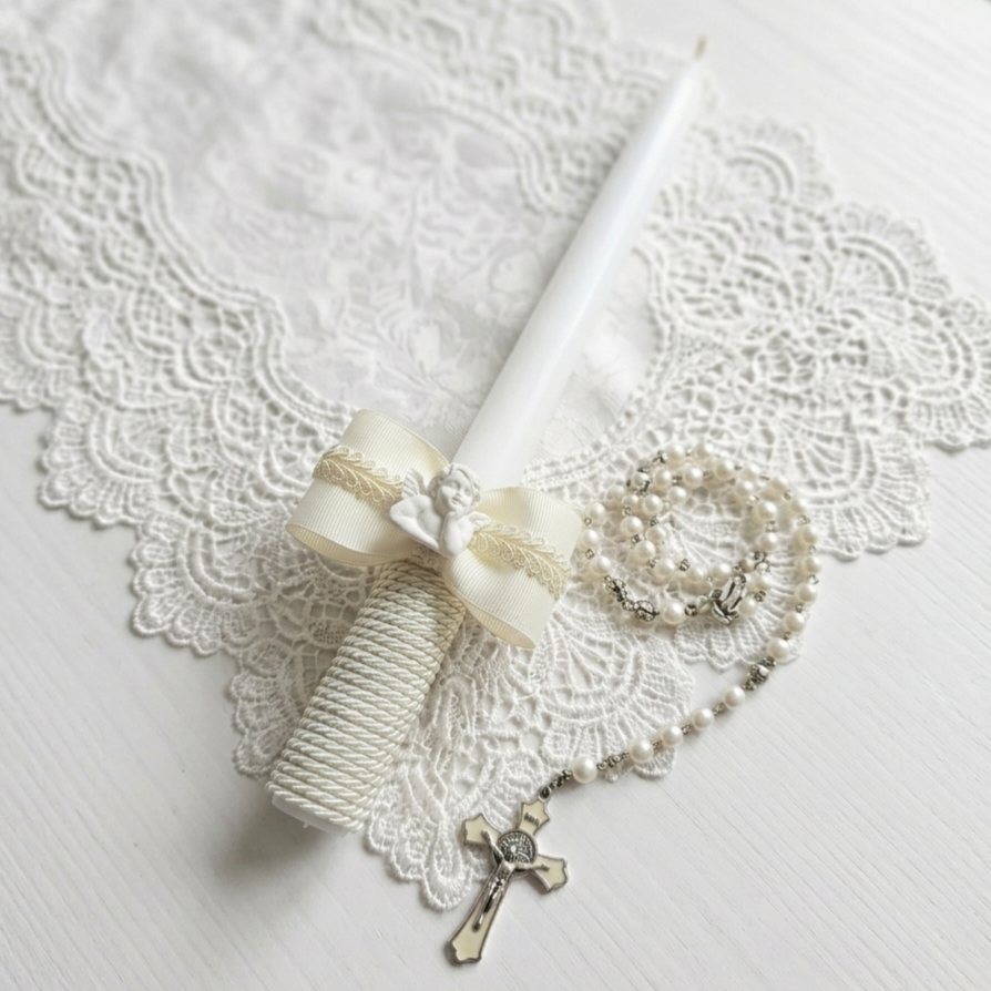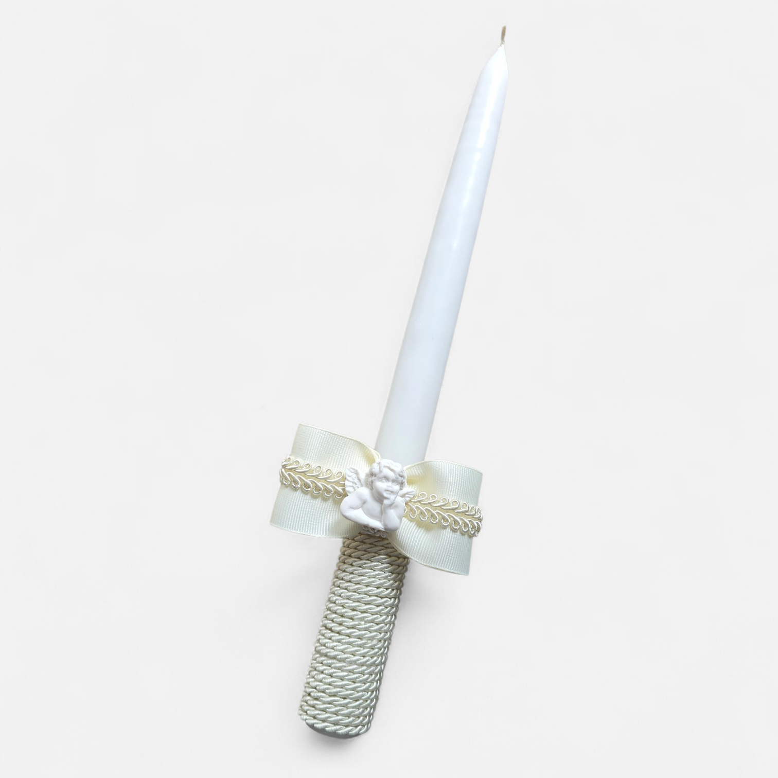 Ši elegantiška, siaurėjanti balta krikšto žvakė – tai ne tik stilingas krikštynų ceremonijos akcentas, bet ir simbolinis šviesos bei tikėjimo ženklas. Apatinė žvakės dalis apvyniota sukta virvele, suteikiančia jaukumo ir natūralumo pojūtį. Papuošta subtiliu baltu kaspinėliu, bei rankų darbo angeliuku iš polirezino, žvakė išlaiko švelnumo, tyrumo ir šventiškumo dermę.