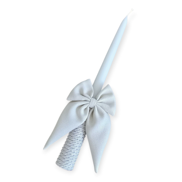 Žvakės ilgis 31 cm, dekoruota sukta juostele bei pieno baltumo siūtu kaspinėliu.