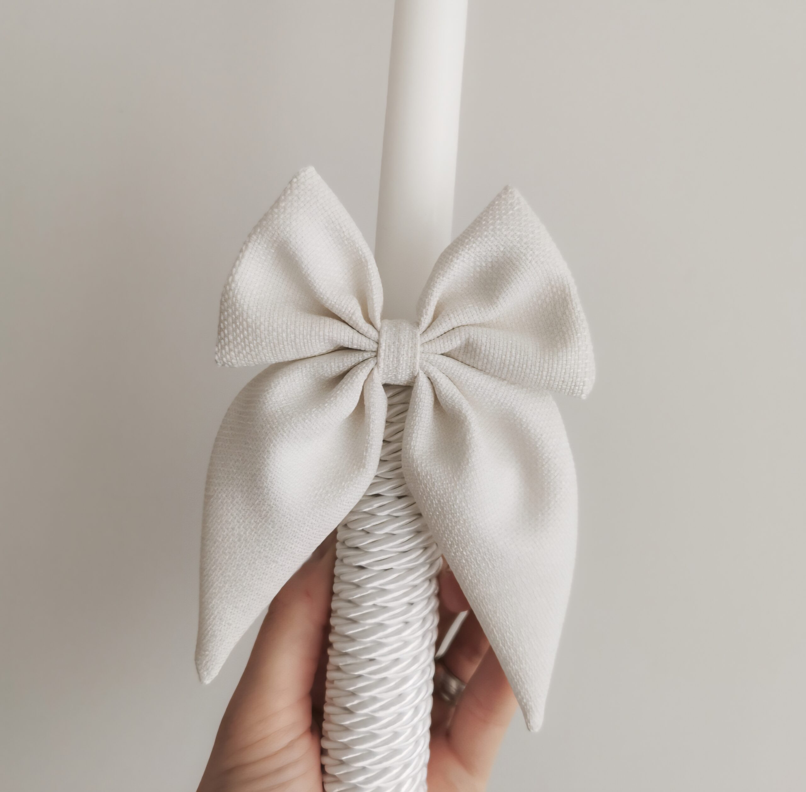 Ši elegantiška, siaurėjanti balta krikšto žvakė – tai ne tik stilingas krikštynų ceremonijos akcentas, bet ir simbolinis šviesos bei tikėjimo ženklas. Apatinė žvakės dalis apvyniota sukta virvele, suteikiančia jaukumo ir natūralumo pojūtį. Papuošta subtiliu pieno baltumo, siūtu kaspinėliu, žvakė išlaiko švelnumo, tyrumo ir šventiškumo dermę.